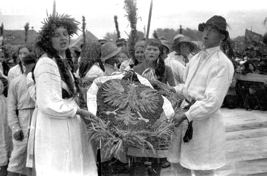 In modern day Belarus, the celebration of Dazhynki has been scaled up to the state level. Every year, the festival designates six “capitals”, one in each of the administrative regions of Belarus, and the entire stupendous might of state support is deployed in festive preparations. The celebration itself – which includes award ceremonies for the winners of various agricultural competitions, folk craft and artisanal exhibitions, processions of workers of various state enterprises, a rally with the President, and festive decorations (such as clichéd figurines made of straw or the Belarusian state emblem made of vegetables and sausages) – usually becomes a subject of ruthless ridicule and sarcastic mocking.