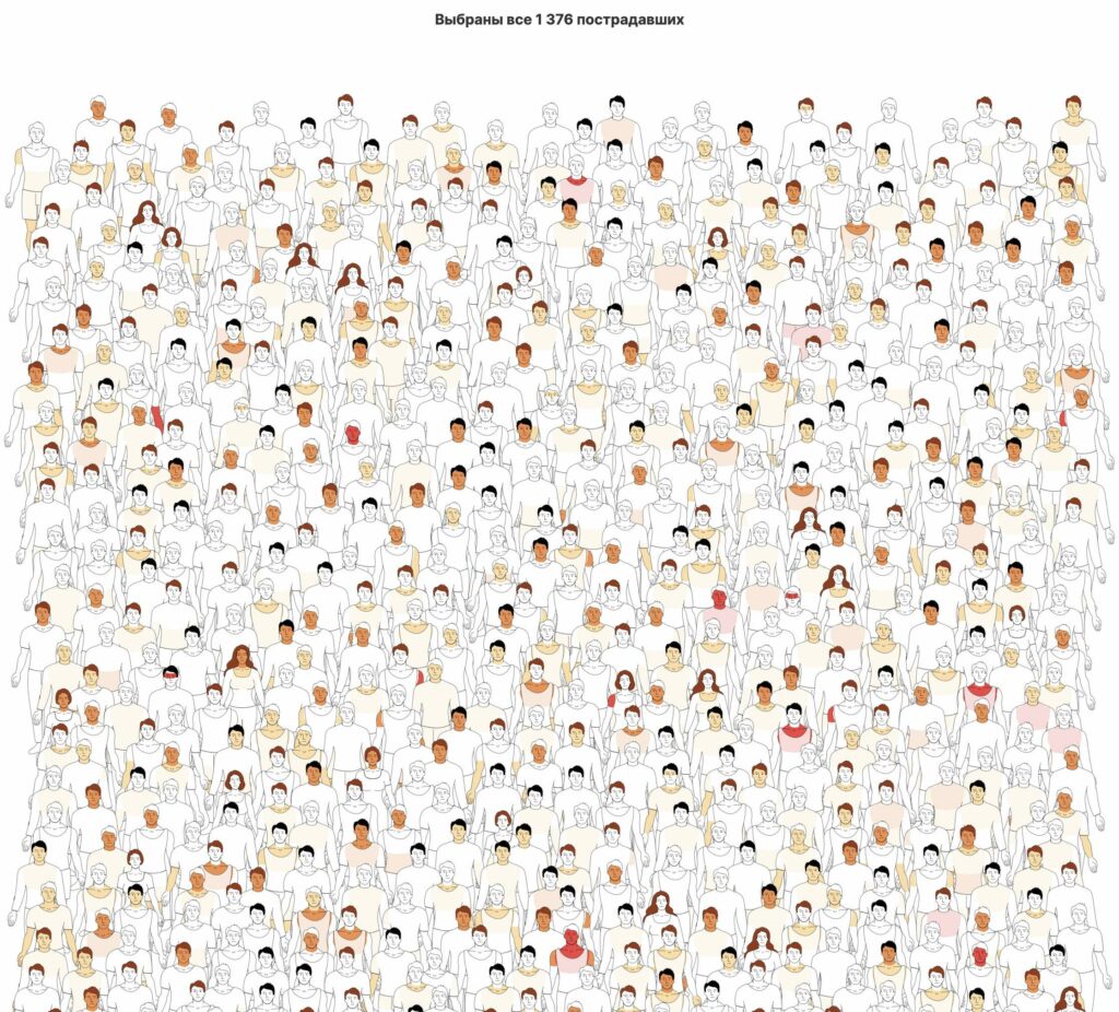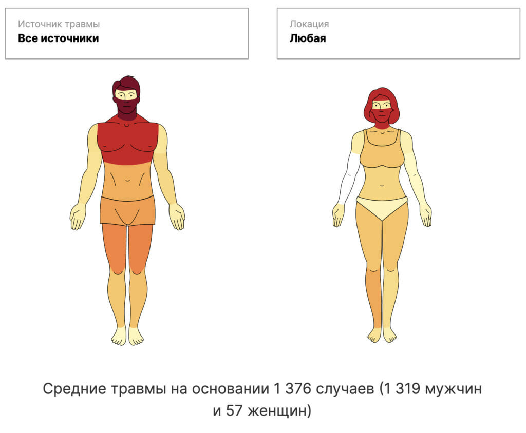 The Investigative Committee materials listed the medical conditions the protesters were diagnosed with. The injuries of each 1,376 victims were body-mapped to clearly determine the most severely affected body parts.