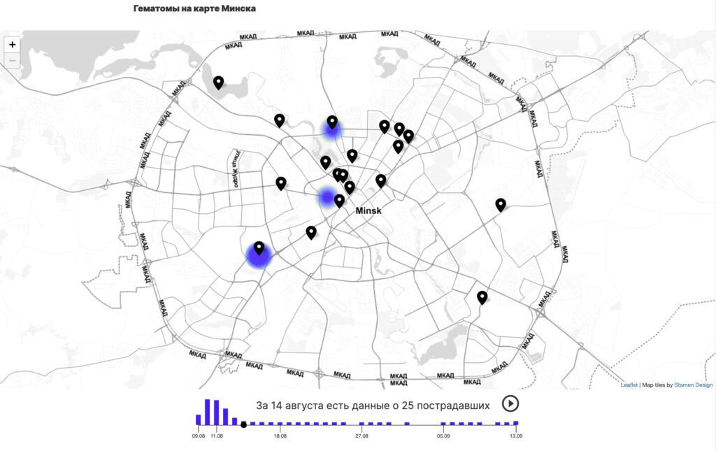 The very same day saw the most massive arrests with more than 3 thousand people taken to police stations. After 10 August, the police basically were beating those who had already been detained or were under arrest – these spots at Akrestsina detention center and police stations are marked on the Minsk map below.