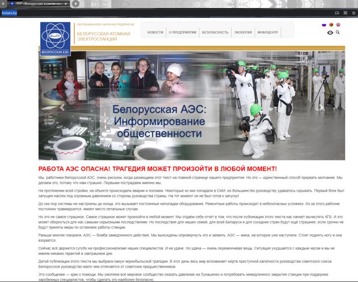 A message from “concerned employees” appeared on the Astravets Nuclear Power Plant website’s homepage. “Operating this NPP is dangerous! Tragedy may happen at any moment!”