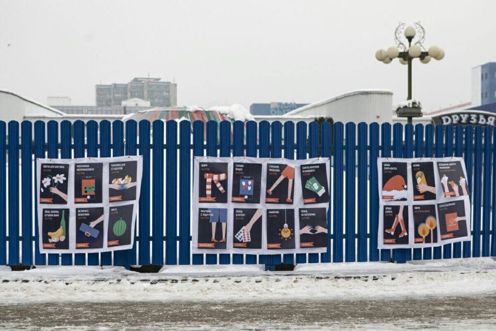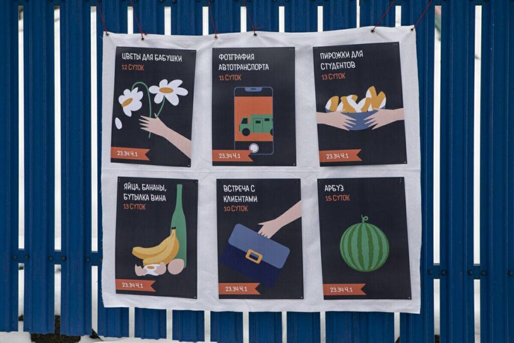 Posters by Natallia Zhukava, designer and artist, appeared on fences and public traffic stops in Minsk. Zhukava’s work is dedicated to people who have suffered from the “defenders of the regime” while they were just going about their business. For example, those buying a light bulb in the store, those who gave flowers to grandmothers or fed them with pies during protest marches of pensioners. The inscriptions on the posters: “Flowers for grandmother – 12 days detention, article 23.34 part 1”, “Photo of vehicles – 11 days detention, article 23.34 part 1” and others reflect absurd accusations for which Belarusians are sent to prison.