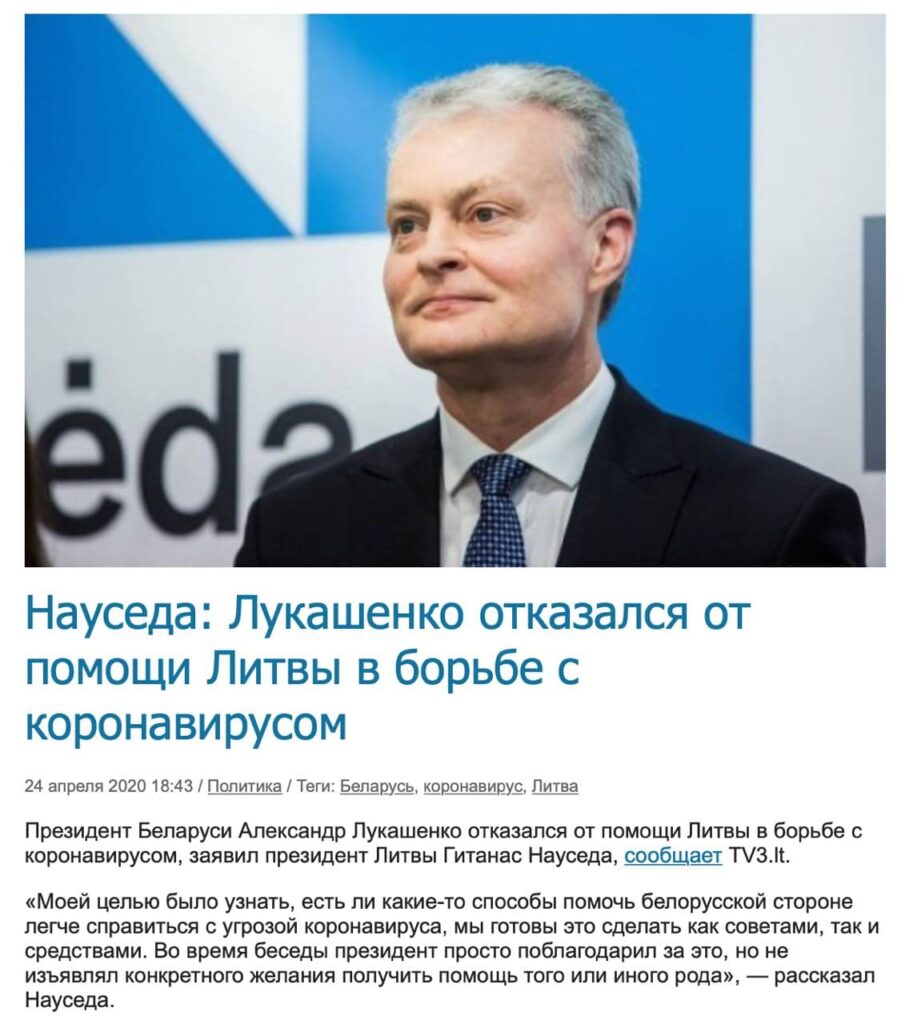 However, a year ago, Lithuanian President Gitanas Nausėda said that Lukashenko himself had rejected the offers of help. Over the past year, $3.8 million have been spent to purchase personal protective, medical and diagnostic equipment for Belarus as a part of the “Solidarity for Health” initiative funded by the EU.