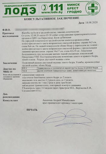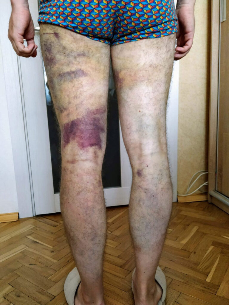 The officer who released Aliaksei told him at parting: “A metro station is over there, get lost. If we find you in five minutes, beg for life.” There was not a soul near the detention centre; volunteers were yet to start keeping watch there. Aliaksei immediately ran away; he shuddered at the sight of cars: he had fears that “they” might be inside. The man spent a few hours waiting for a first public vehicle. On the way home, he fainted several times and hit the ground. In the epicrisis, doctors wrote: “rupture of the muscles of the left thigh, injuries and bruising wounds of the chest and thighs”.