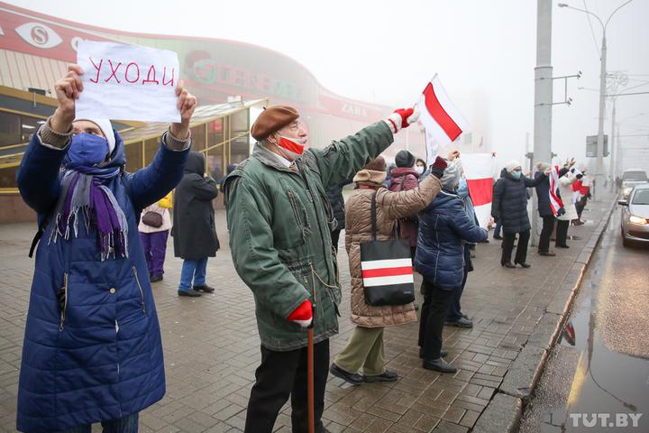Die traditionelle Aktion der Pensionäre fand in Minsk in einem aktualisierten Format statt. Mehrere Dutzend Menschen mit Fahnen und Plakaten stellten sich entlang der Hauptstraße in der Nähe der U-Bahn-Station „Wostok“ zu einer „Kette der weisen Solidarität“ auf. Die Aktion dauerte ungefähr eine Stunde und endete ohne Festnahmen. Der Ort der Aktion war verschlüsselt. „Die Weisesten versammeln sich am Punkt der Weisheit“, „Geolocation: TKNK FF“, so wurde der Sammelpunkt beschrieben. Die Aktion wurde von Rentnern in anderen Städten von Belarus unterstützt.