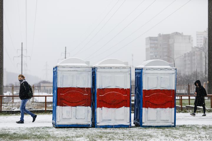 « J’ai observé moi-même l’installation des toilettes blanc-rouge-blanc », confie un habitant local, Aliakseï. « Ils l’ont fait avec un appareil de manutention, et un minibus était garé à proximité, à l’arrêt de bus dans la rue Guintawta, similaire à ceux qui participent aux dispersions des manifestations. Je ne sais pas si ce minibus avait quelque chose à voir avec les toilettes, je ne me suis pas risqué à demander ce que c’était, en passant ».