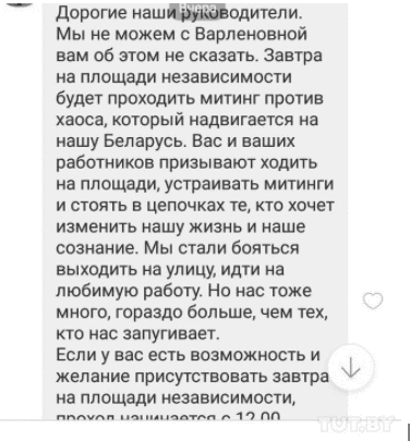 ‘The boss called and said that they received a call from the district council saying that two people from each organization in the town (the head and the trade union representative) should go to Minsk to meet with the president. They said nothing about the fact that it is going to be a rally in support of the president. They promised to arrange meals. I don’t want to let my boss down (he is a very good person and is also against Lukashenka). I’ll be wearing white. Long live Belarus! We live 350 km from Minsk’, the report says.
