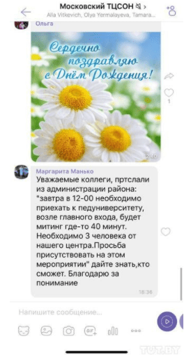 “Dear colleagues, a message from the district administration: “tomorrow at 12 you need to come to the pedagogical university’s main entrance, there will be a rally lasting at around 40 minutes. 3 persons from our centre are needed for participation. We ask you to attend this event” let me know who can attend. Thanks for understanding”