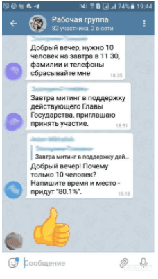“— Good evening, 10 people are needed to come at 11:30, I need names and phone numbers — A rally in support of the current Head of the State is going to take place tomorrow. I invite you to participate. — Good evening! Why just 10 people? Give the time and place, all 80.1% of the voters will come.”