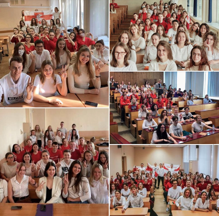 - The student channel “Otchisleno” (“expelled”) reports that students of Belarusian technical University, Belarusan Economics University and the BSU Institute of Business came to class wearing white and red T-shirts. Belarusian State University students lined up along the hallways and chanted “One for all and all for one”.