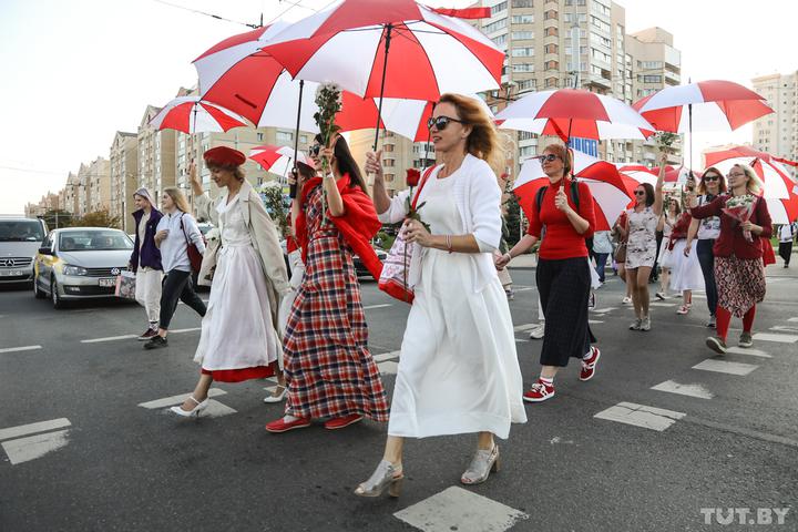 5:45 pm A small procession of women with white-red-white umbrellas is passing by the Sportivnaya metro station. Women are headed to the memorial on Pushkinskaya.