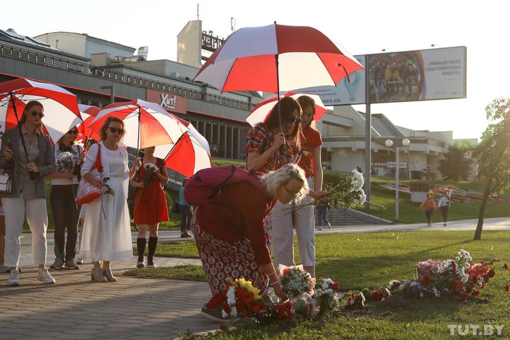 6:07 pm A group of women with red and white umbrellas held a demonstration and placed flowers at the memorial for Aliaksandr Taraikouski.