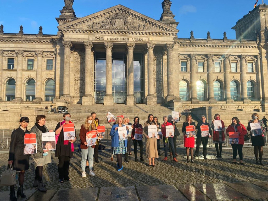 6:25 pm Women from the Social Democratic Party of Germany held a rally at the Bundestag. They held portraits of Belarusian women who were arrested for participating in protests and expressing their opinions, including Svetlana Alexievich, Nina Bahinskaya, and Liliya Vlasova.