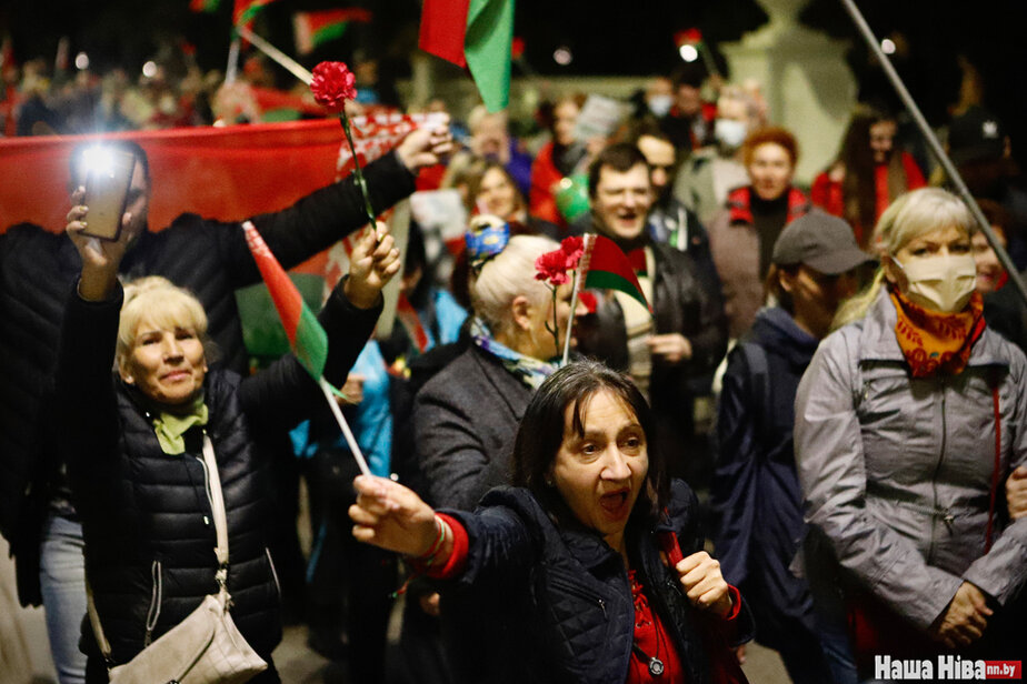 7:41 pm A rally and march in support of Lukashenko started at the Independence square in Minsk. Participants sang the song “Invisible Battle” at the walls of the Ministry of Internal Affairs. The lyrics glorify the never-ending and dangerous work of the police.