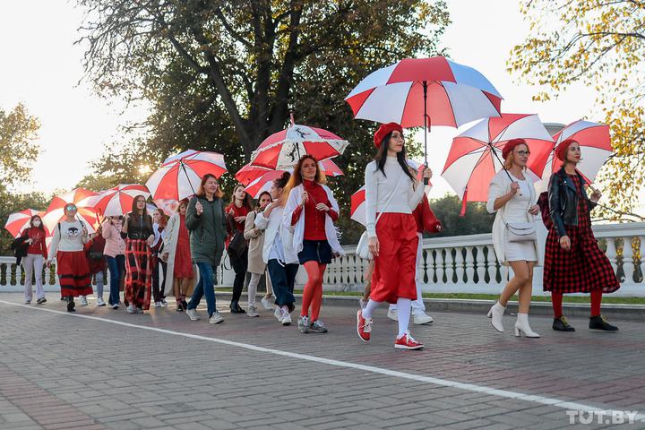 6:10 pm A group of women in red were marching along Independence avenue, drawing attention. The “We are Just Taking a Walk” rally, named after Nina Bahinskaya’s defiant response to a riot policeman, has become a tradition.