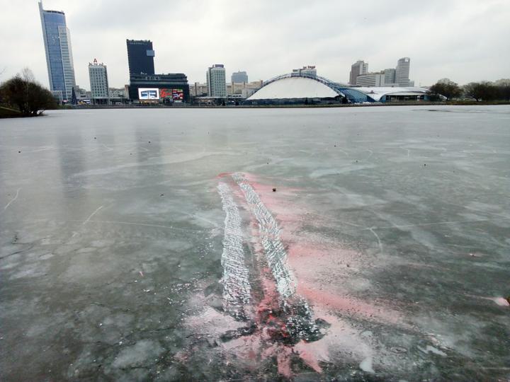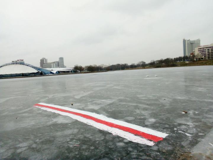 Białorusini mają nowy trend w protestach – czerwono-białe flagi są rysowane na oblodzonej powierzchni zbiorników wodnych