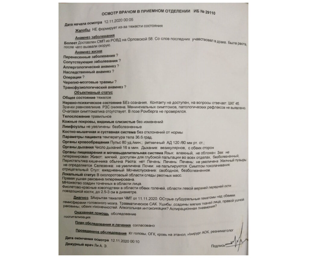 Based on the results of the examination, Raman was hospitalized with the following diagnosis: “Closed severe traumatic brain injury (TBI) as of 11 November 2020. Acute subdural hematomas over both hemispheres of the brain (usually due to rupture of intracranial veins lying in the subdural space, which leads to an increase in intracranial pressure with compression and possible damage to the brain). Traumatic SAH (subarachnoid haemorrhage – haemorrhage in the subarachnoid space (the cavity between the arachnoid mater and the pia mater)).” Bruises, abrasions of the soft tissues of the face, right auricle, and both of the lower extremities.