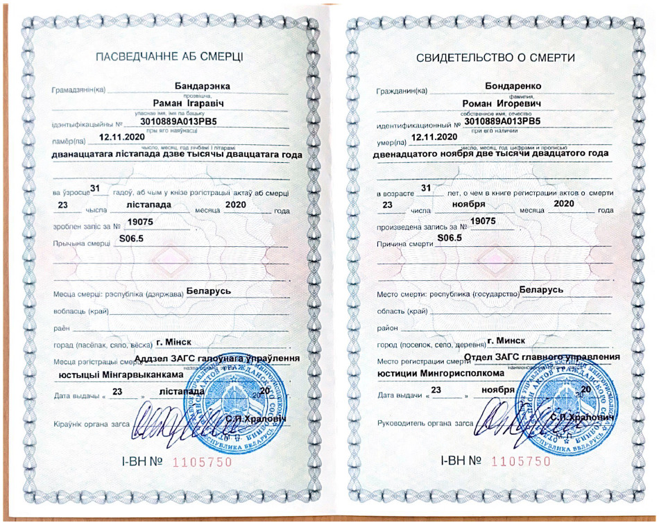The cause of Bandarenka’s death has been established, and has long been known. It is directly stated in his death certificate issued on 23 November 2020, under the code “S06.5”. According to the International Classification of Diseases, this code stands for “Traumatic subdural haemorrhage”.