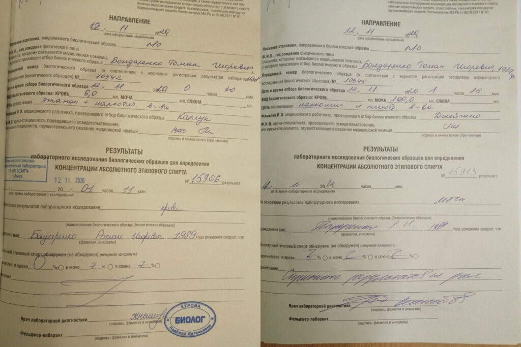The clear answer to the question whether Bandarenka was in the state of alcohol intoxication at the time of the events under investigation is given by the results of the laboratory analysis of his biological samples taken upon admission to the Hospital of Emergency Care. The absence of traces of ethyl alcohol in Raman’s blood indicates that he was sober (a preliminary diagnosis of “alcohol intoxication” was issued upon admission to the hospital on the basis of the anamnesis following the phone call for an ambulance and the presence of traces of vomit in the perioral region). The possible presence of traces of alcohol in other biological samples from Bandarenka’s body, which the representatives of the current political regime insist on, can only indicate that he may have consumed alcoholic beverages in the past, and has no legal grounds for assessing the circumstances and causes of his death.