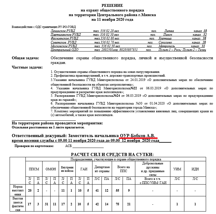 According to the “Public order maintenance resolution on the territory of the Central District of Minsk on 11 November 2020”, Babkou was the officer on duty at the Police Station.