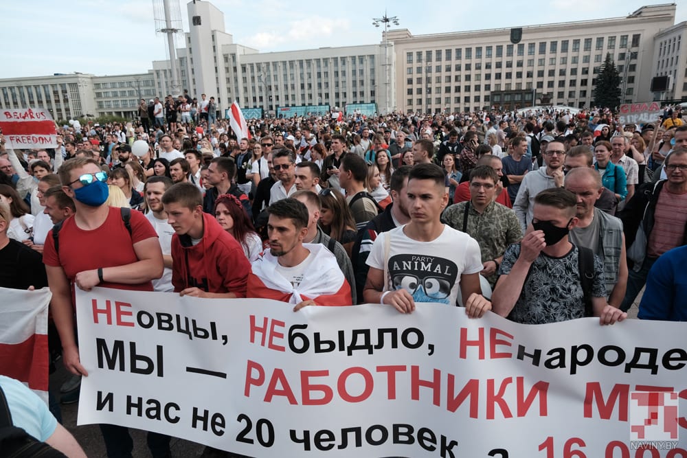 Today, several thousand employees of Minsk Tractor Works (one of the biggest government-owned plants in the country) and other enterprises with their posters, banners and demands freely reached the square in front of the Government House. But nobody came out to them. The authorities are afraid of strikes, however they do not even demonstrate the willingness to real dialogue (the few attempts of scared local officials to come out to people are not taken into account). They have only cleaned up the streets from the riot police (OMON) and started releasing exhausted prisoners, who were captured during the protests after the elections held on August 9, and by the method of a random police abduction.
